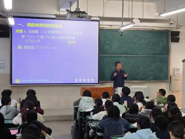 周勇老师以“函数单调性的判定”为主线,通过精心设计的教学环节,引导学生逐步掌握利用导数分析函数变化规律的核心方法。课堂上,周老师从中学数学知识基础出发,通过典型例题的层层剖析,生动展示了导数在函数性质研究中的实际应用,注重启发学生思维,培养学生的逻辑推理能力。他借助多媒体课件清晰呈现知识点之间的内在联系,通过互动提问等方式调动学生积极参与,课堂节奏流畅,学生专注度高,展现了扎实的教学基本功和良好的课堂组织能力。