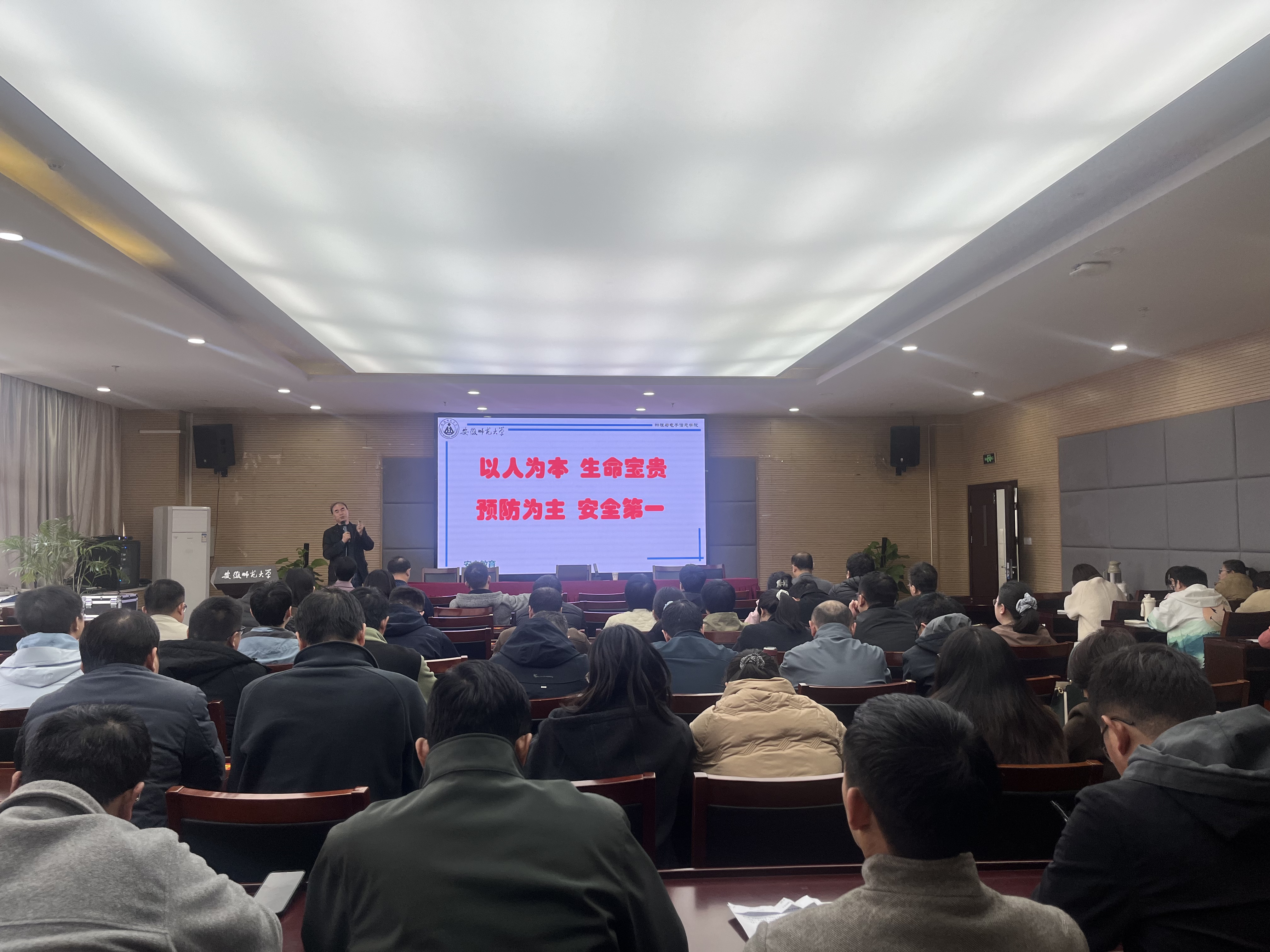 会议还开展了实验室安全专项警示教育。宋静通报了重庆某高校实验室安全事故情况,传达了学校相关工作要求,邀请学院工科实训中心主任蔺玉柱为教职工做专题辅导报告。蔺玉祝在讲座中结合自身多年实验中心管理经验,就如何强化实验安全意识,增强安全防范能力为同事们做出细致指导,提醒大家深刻认识实验室安全工作的重要性和紧迫性,坚持“安全第一、预防为主”,时刻绷紧安全之弦,以“时时放心不下”的责任感和“事事落实到位”的执行力确保学生安全。