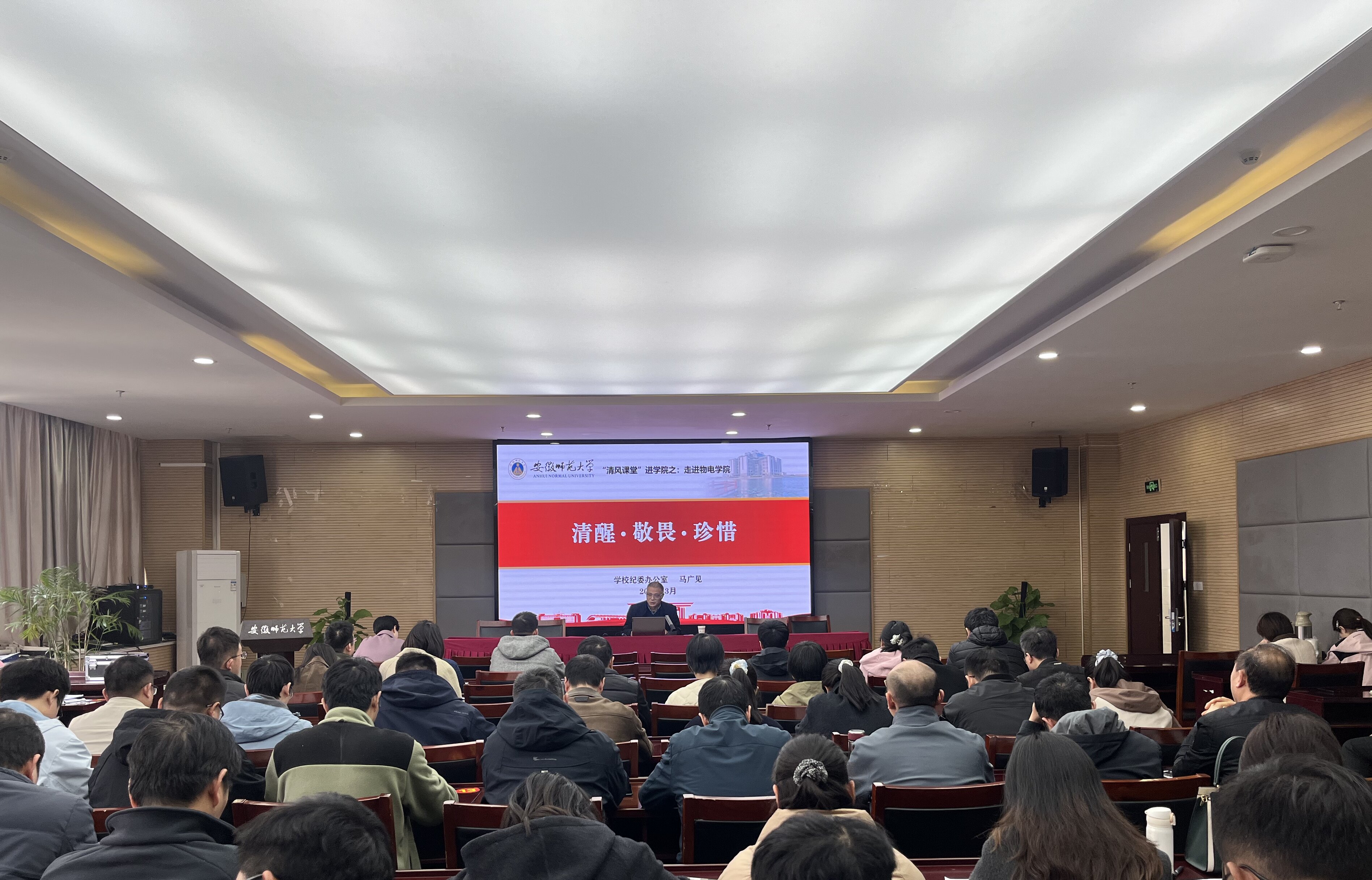 会上,马广见从保持清醒、心存敬畏和学会珍惜三个方面层层递进式地为老师们上了一堂发人深省的师德师风课。他在讲座中指出,全面从严治党已是常态,严的基调只会越来越严,高校绝非净土,全体教职工要保持清醒的认识,始终绷紧纪律规矩这根弦。讲座中,他结合丰富的案例,着重讲解了意识形态领域问题、违反中央八项规定精神问题、师德师风失范问题等七类常见违纪表现,用鲜活的案例和这些行差踏错的“案中人”教育警示大家要常怀敬畏之心,以案为鉴、以案明纪。他语重心长地提醒各位老师,要算好人生账,筑牢防火墙,珍惜现有工作和生活,严守纪法红线,坚决杜绝各类违法违纪行为,共同维护风清气正的育人环境,落实立德树人根本任务。