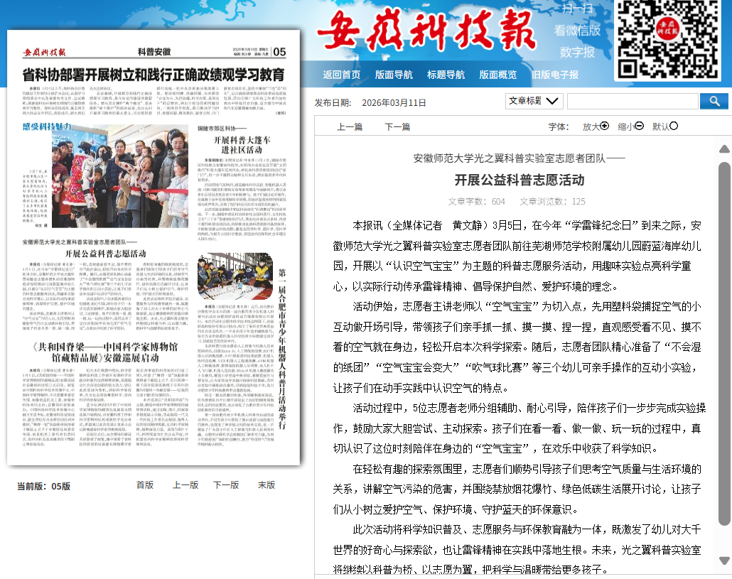 学院系列“学雷锋”志愿服务活动还受到安徽科技报(纸媒)、安徽日报等主流媒体的广泛关注与报道,产生了良好的社会反响。