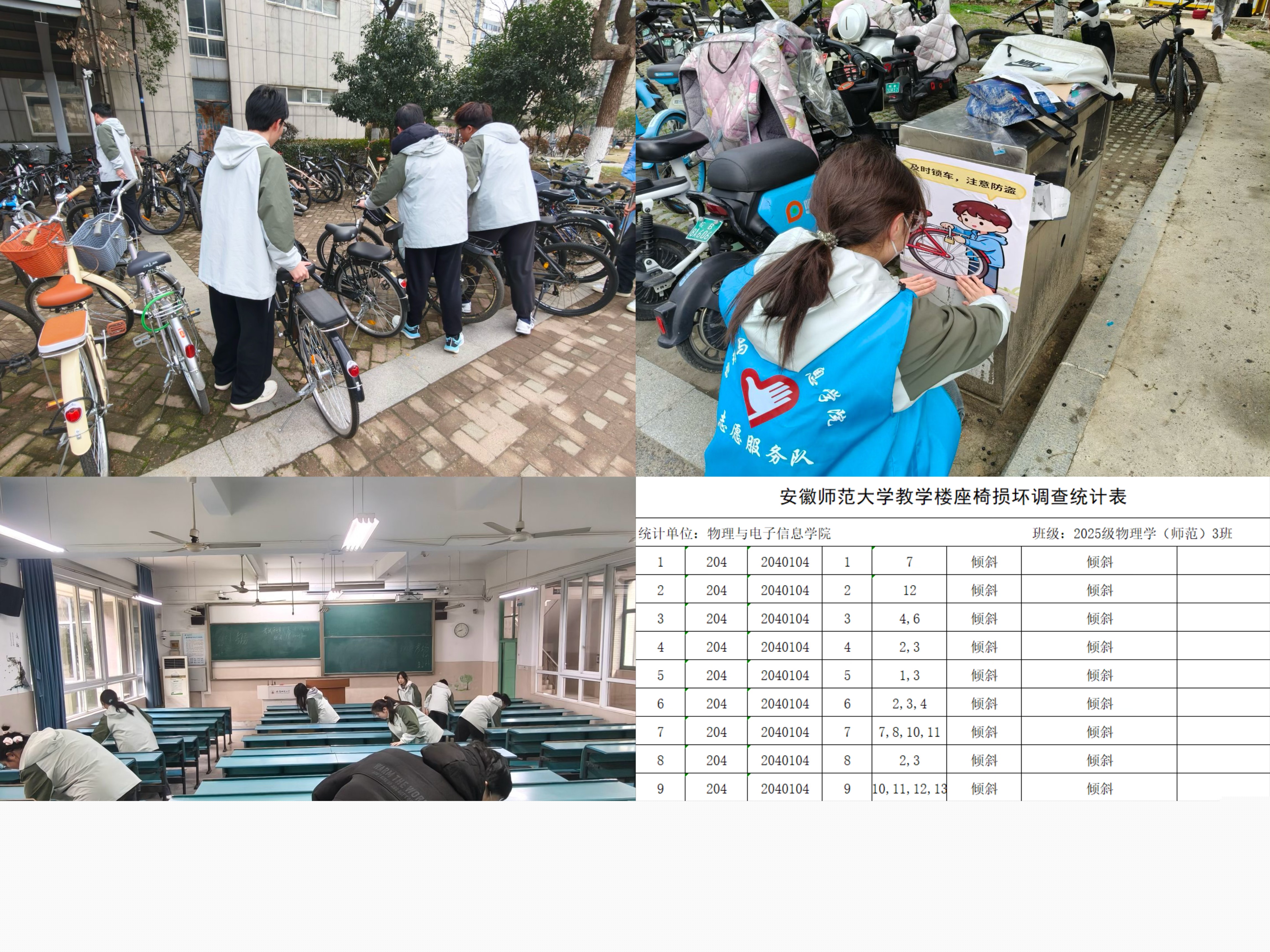 力行学思践悟,青春担当显风采。各班级积极响应号召,广泛开展“学雷锋,见行动”主题活动。同学们热情高涨,主动承担教学楼教室损坏座椅检查、校园非机动车规整、学院楼环境卫生清扫等任务,用点滴行动美化校园环境,展现新时代“雷锋式”青年的责任与担当。