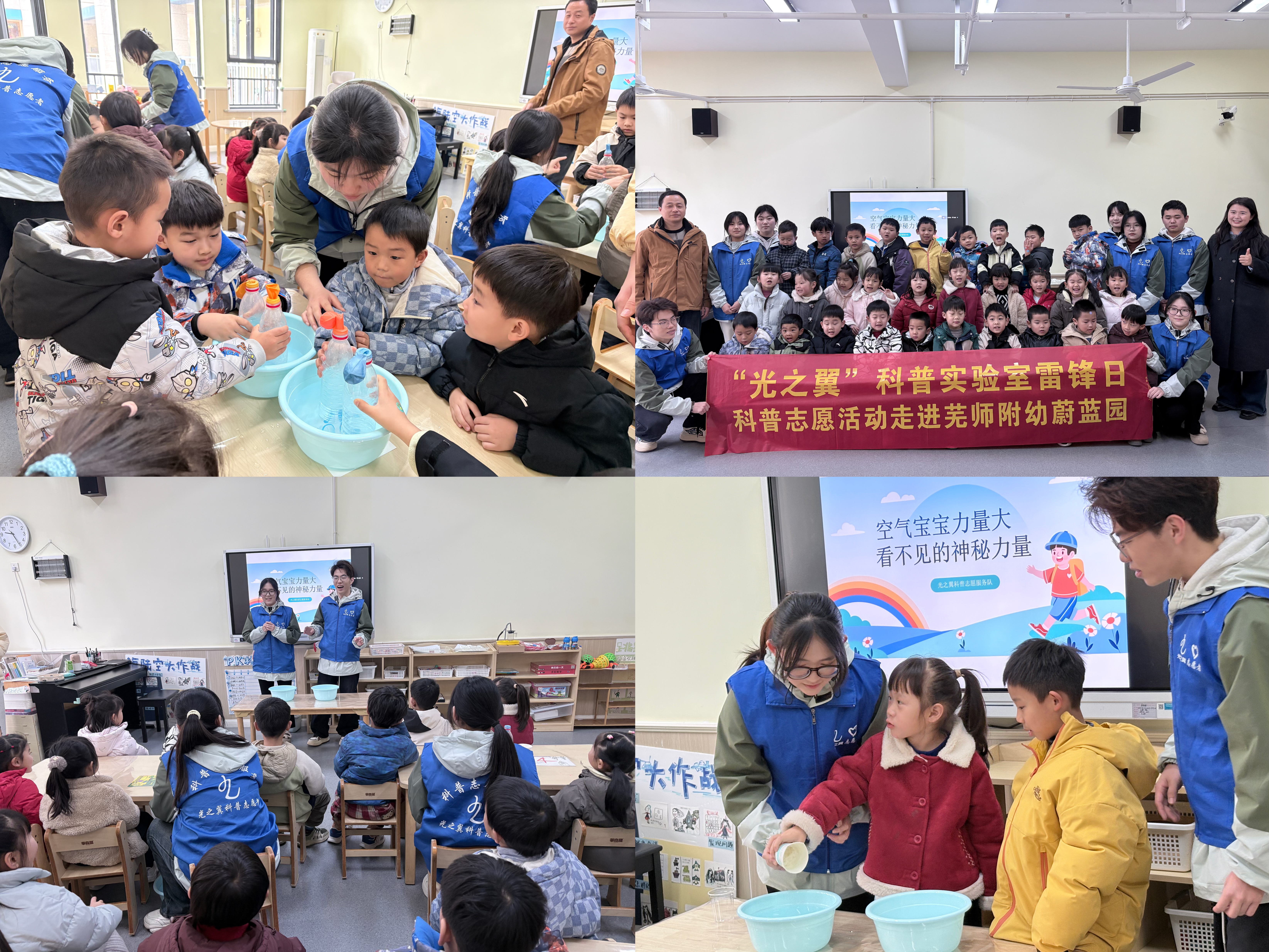 启蒙科学精神,科普课堂润童心。学院团委组织“光之翼”科普实验室走进芜湖师范学校附属蔚蓝幼儿园,开展趣味科普教育活动。志愿者们通过生动的科学演示游戏,向孩子们讲解“生活中的物理”,让抽象原理变得可感可触,在欢声笑语中播撒科学的种子。此外,志愿者还前往特殊教育学校,为“糖宝”们精心设计科普互动环节,用温柔与耐心陪伴孩子们感受科学的奇妙。