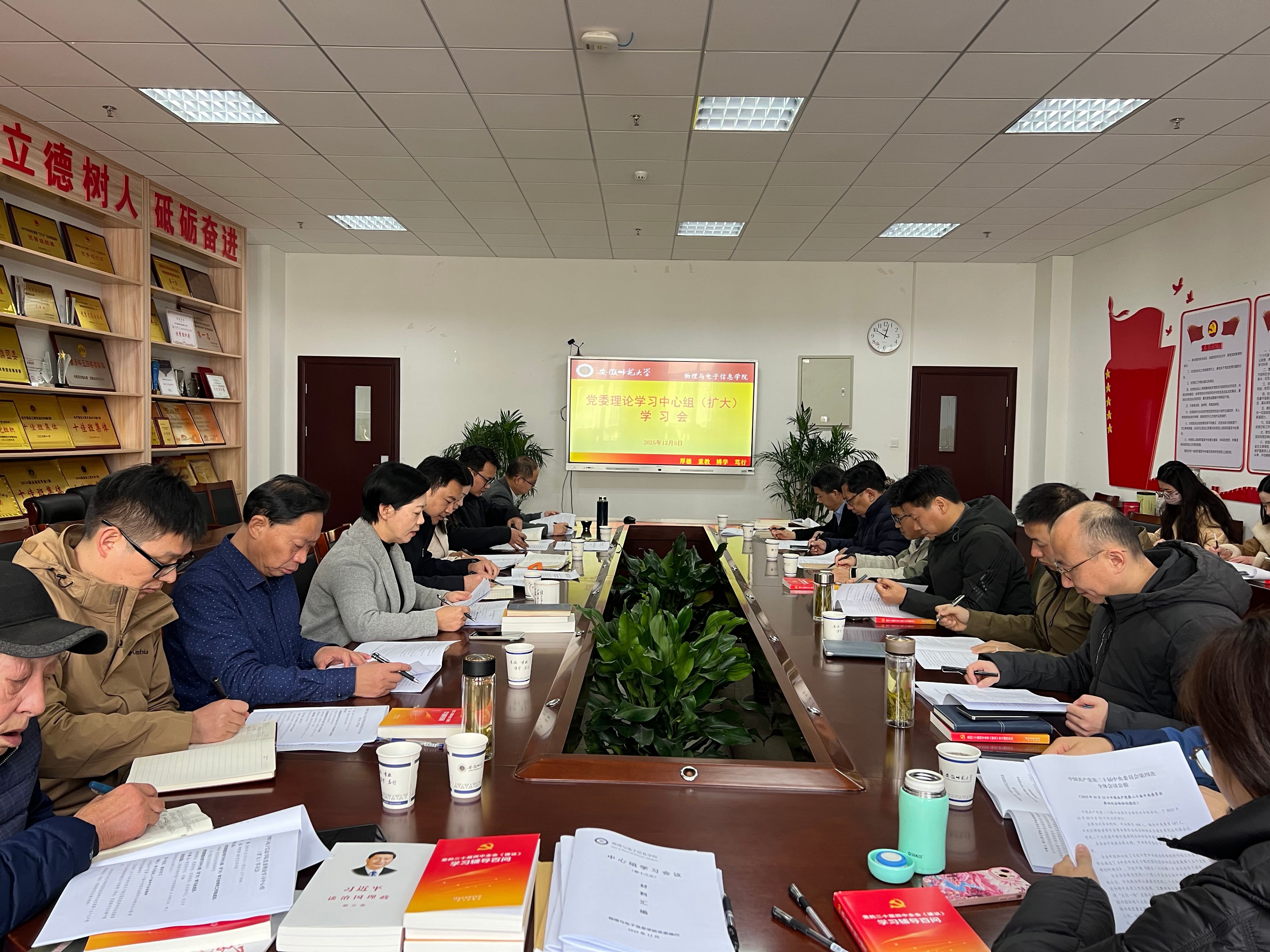 召开党委理论学习中心组(扩大)学习会,集中学习党的二十届四中全会精神。学校党委理论学习中心组列席旁听工作组成员、组织部副部长李高举和机关党委秘书王美来院旁听指导。会议由党委书记宋静主持。学院领导班子成员、党委委员、纪委委员、党支部书记、系主任参加会议。